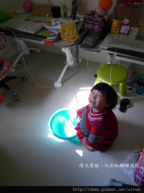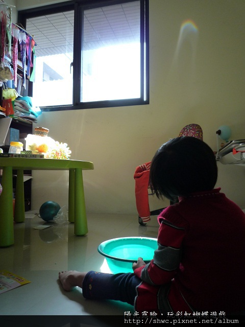 小綠妹妹看見彩虹的光一出現,就很開心地讓彩虹光在房間各個角落到處跑。