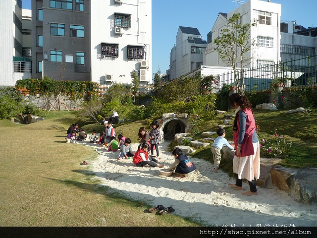 今天早上的太陽很大,剛好小朋友也都出來草地活動,有的玩球,有的玩沙。