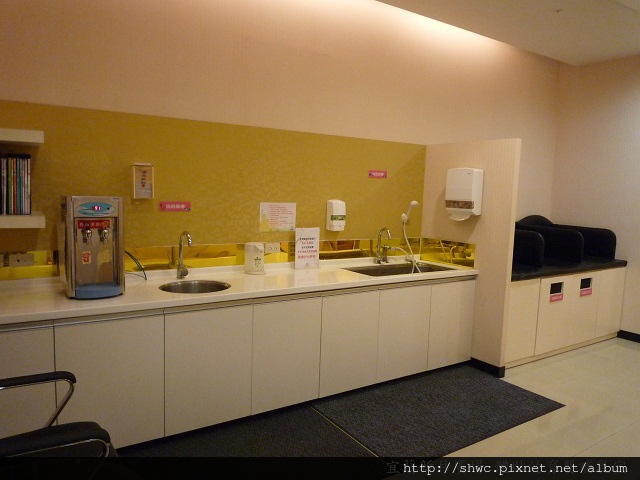 除了有供洗屁屁的溫水沖洗槽外,還有提供洗奶瓶的水槽。