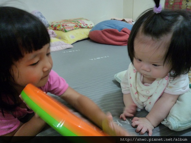 晚上終於見到波妞小表妹,我們家兩個小朋友都很會照顧小妹妹,小綠妹妹還親自示範巧虎玩具給波妞妹妹看。