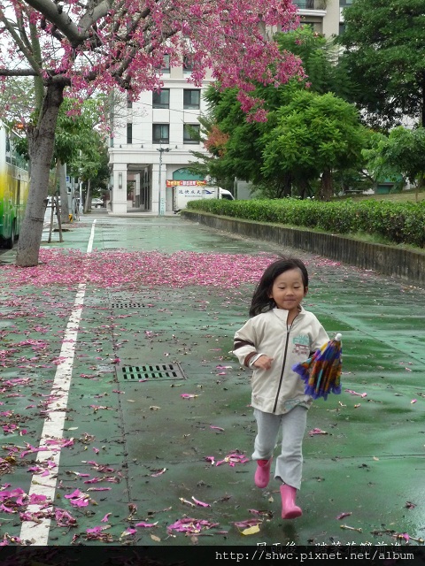 下雨了!前幾天的風雨將美人樹的花吹了滿地。 我還特別要小綠妹妹窗上雨鞋,拿著小雨傘出門。 就是為了讓孩子體驗一下下雨的感覺。