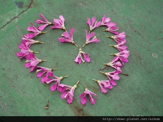 我們母女倆就撿了美人樹的落花,在人行道上排了一個愛心的形狀。沒想到也吸引人家拍照耶!