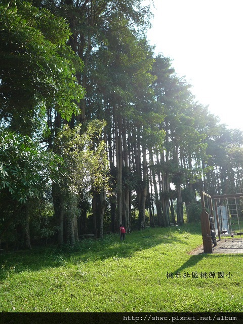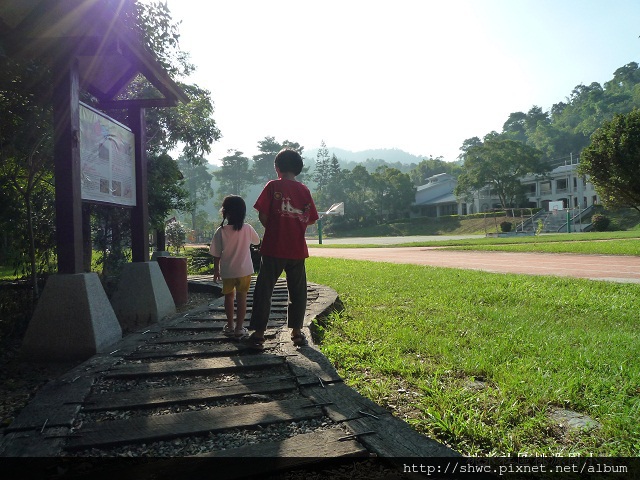 步下木頭的階梯,沿著枕木步道來到桃源國小。