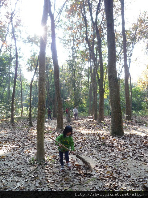 傍晚金黃色的陽光偶爾從樹枝葉縫間瀉下,老公就跟兒子在樹林間玩踢球,小綠妹妹拿起一旁的竹掃把掃起落葉。