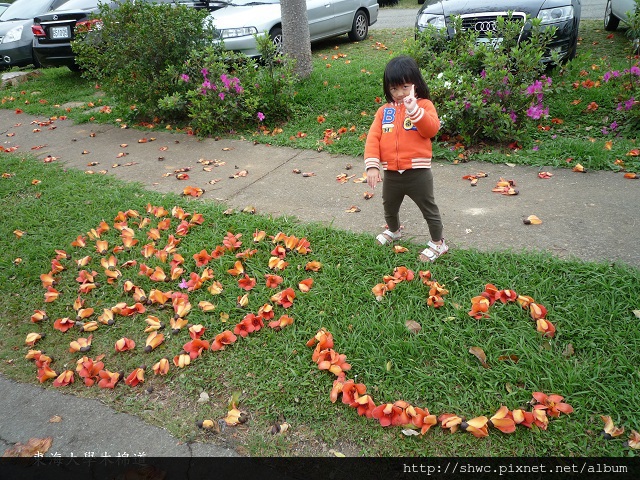 看見滿地掉落的木棉花,於是就找了兩個孩子在路邊的草叢開始排圖案。