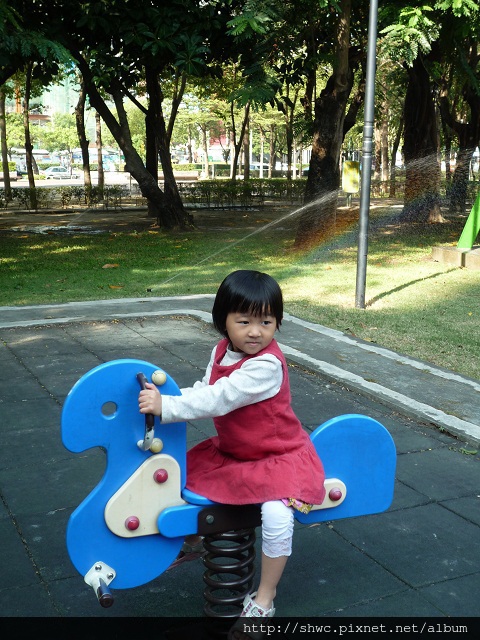 就在小綠妹妹騎搖搖馬的時候,我拍下彩虹在後方的照片。