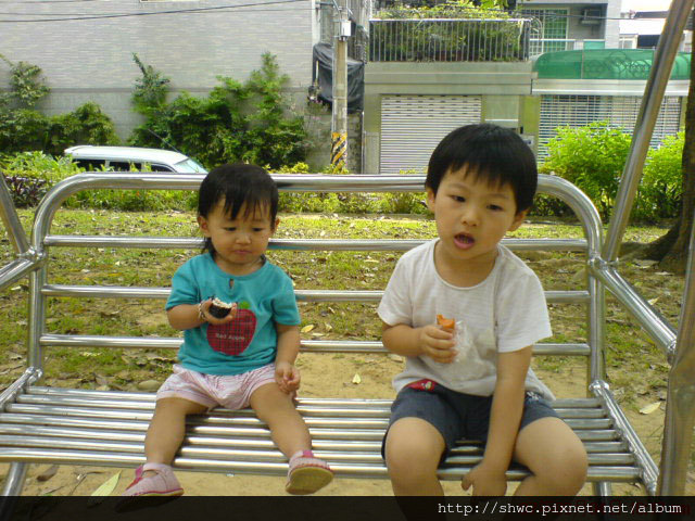 享受清風及早餐,兩個小朋友也搖得很高興。
