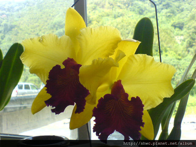 我們選擇靠溪邊的餐桌坐,店家在旁邊擺了一排美麗的蘭花。剛好跟後面的山景及溪流呼應。