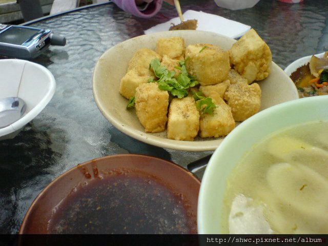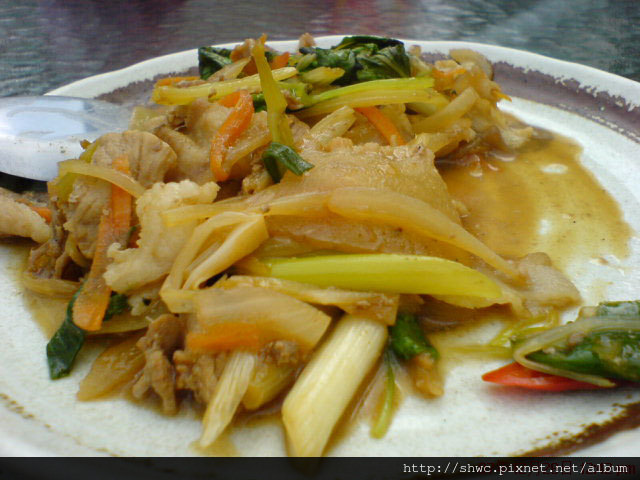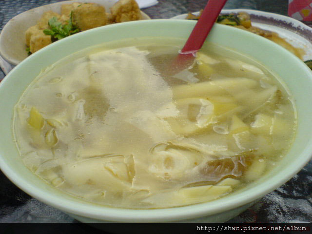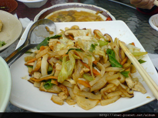 我們點了好幾樣菜,炒山豬肉,清炒高麗菜,炒河粉,酥炸豆腐及竹筍湯。