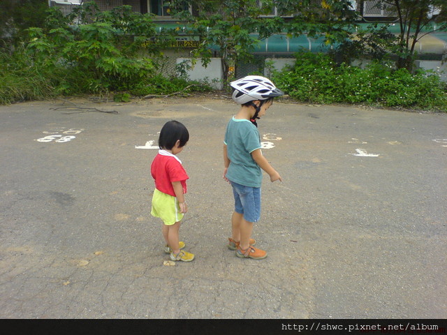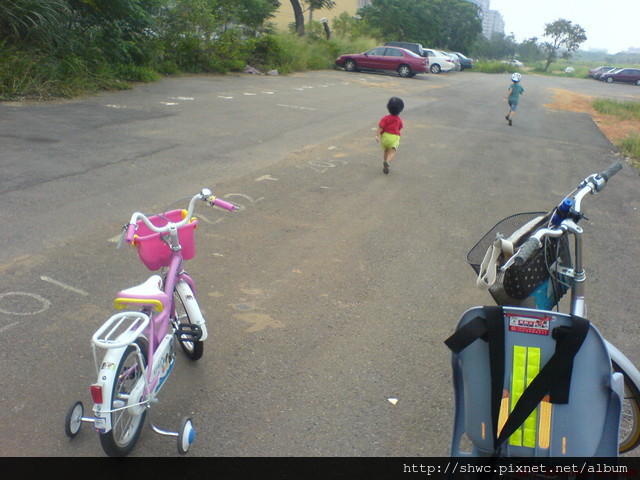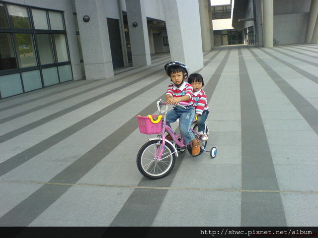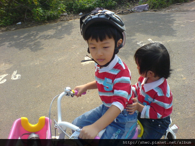 小綠雖然腳比較短,踏板踩不到,也很認真堅持地要跟哥哥騎車。