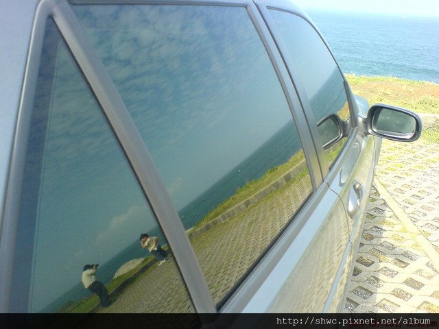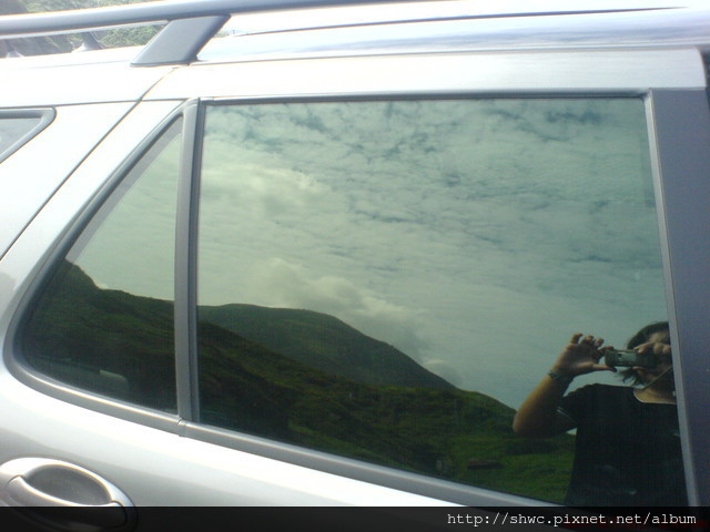 看著山、海、雲、天的風景映照在車窗上,我忍不住拿起相機拍照。