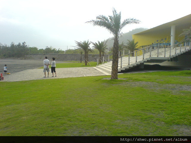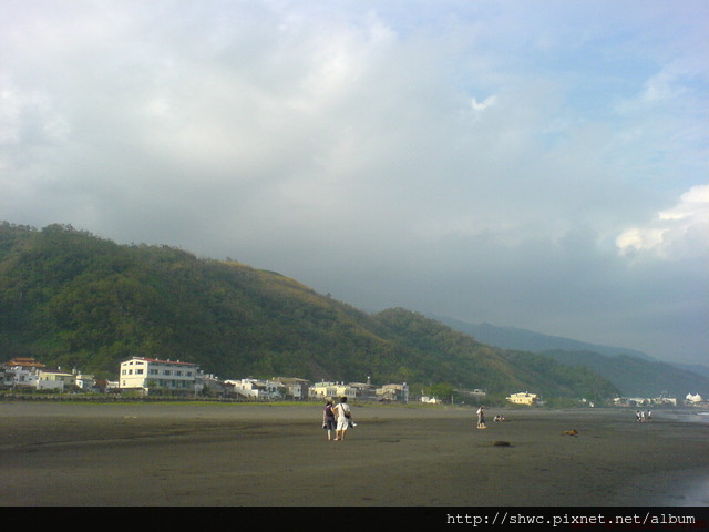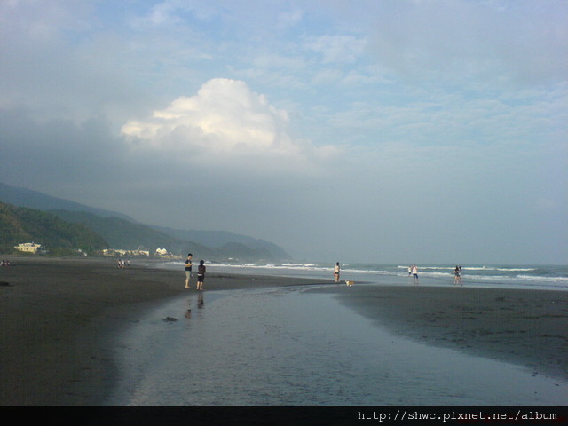 原來有一大片黑色的沙灘,旁邊有一彎淺淺地流水,有幾個人在衝浪。
