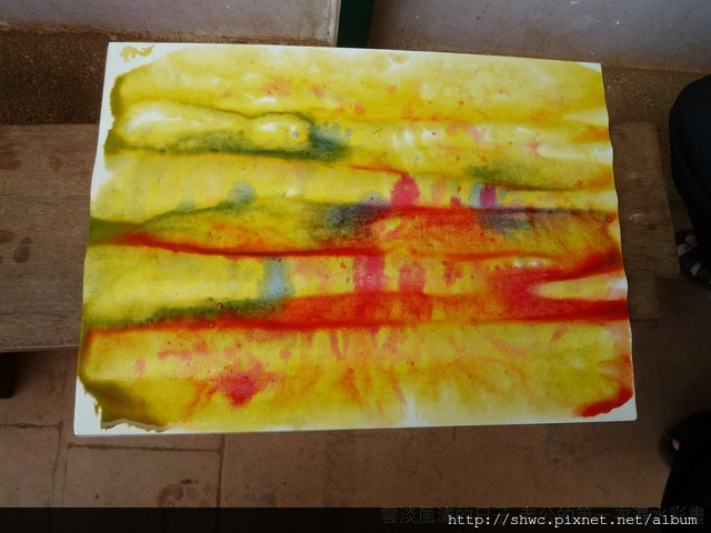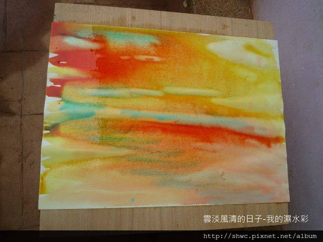 可惜我不曉得該怎麼帶他?所以將畫紙泡濕後,我將六個顏色準備好。