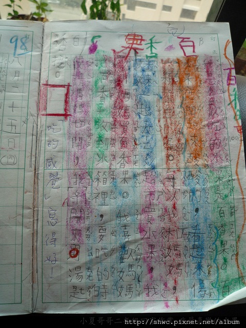 一邊寫一邊數數看寫了幾個字,而且他還覺得作業本太單調,所以每寫一行他就塗一排顏色。