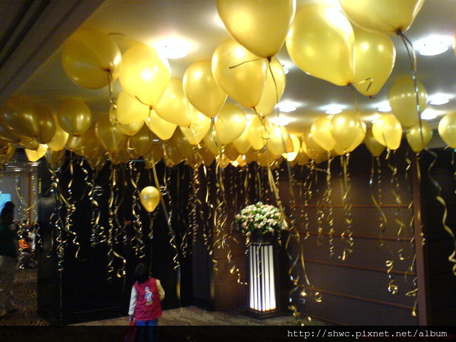 哇!好多金色的氣球飄在天花板上,裡面放映著卡通還有兒童歌曲。